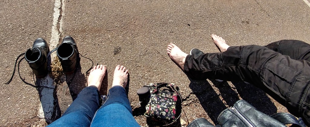 That is, until I feel Sensi jump up on the bed next to the tickle with an aura of interest. The tickle persists and I figure I must have a small spider on me, it’s happened before. In the pale glow I see something that is clearly the wrong shape for a little spider as I start shooing Sensi away. The shape stops in that lovely relaxed tail position letting me know that so long as the cat stays away from it, this little scorpion on my bare leg isn’t going to sting me. But she’s also not going anywhere. So I turn on my phone flashlight for a better look, and indeed she is one of our little desert scorpions.